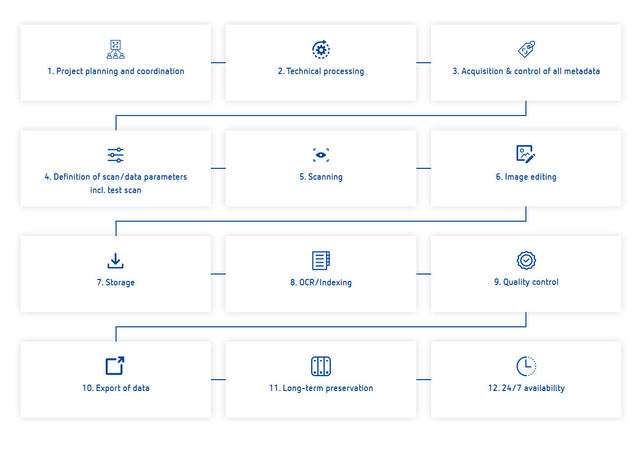 Then, based on your request, all important and/or frequently used documents are digitized and pass through the process steps described below.