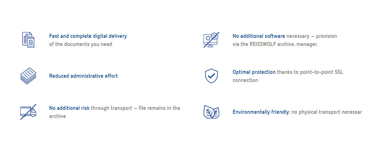 With our hybrid archiving system, we offer you a solution in which digital files can be integrated into the archive holdings in parallel with whole or partially stored stocks of your paper files, managed by our REISSWOLF archive. manager. software. This allows you to digitize only when needed and still have access to your entire archived corporate knowledge at all times.