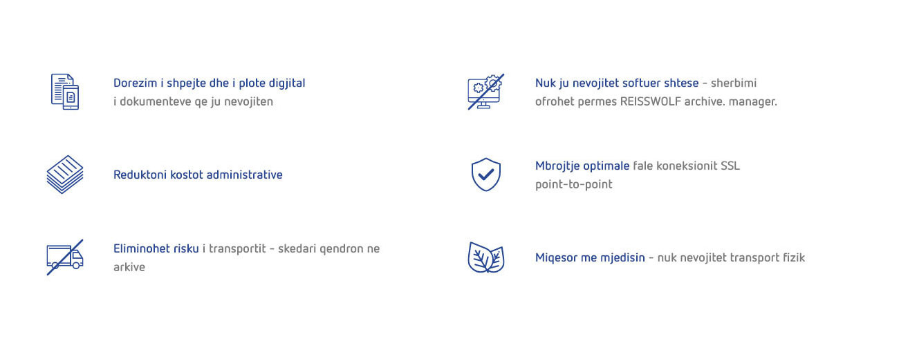 Sepse digjitalizimi nuk reduktohet thjesht në procesin teknik të skanimit. Digjitalizimi përfshin një rrjedhë të gjerë pune, e cila mund të jetë një faktor i konsiderueshëm kohe dhe kostoje. Një zgjidhje më e mirë është arkivimi tek REISSWOLF - i sigurt dhe më efektiv sa i përket kostos - i të gjitha dokumenteve tuaja origjinale (p.sh. certifikatat), si dhe i të gjithë skedarëve dhe dosjeve në të cilat pothuajse asnjëherë nuk ka qasje. Dhe nëse kërkohet, atëhere shërbimi ynë i Skedarit Hibrid do të plotësojë arkivat tuaja fizike edhe në formën digjitale.